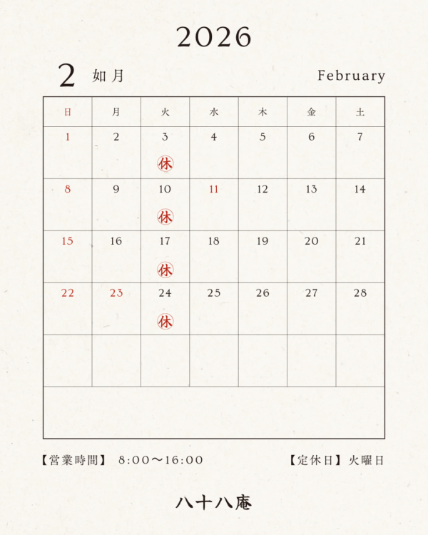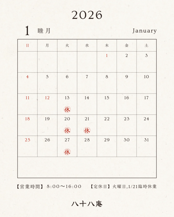新着情報 2026年01月07日 【大窪寺門前本店】1月,2月定休日のお知らせ 【2026年1月,2月営業日カレンダー】 八十八庵をご愛顧いただき誠にありがとうございます。 2026年1月13日より2月末まで火曜日を定休日とさせていただきます。1月21日(水)は臨時休業いたします。 何かとご不便をおかけすることと存じますが、なにとぞご了承賜りますようお願い申し上げます。 八十八庵店主 前へ 一覧へ戻る